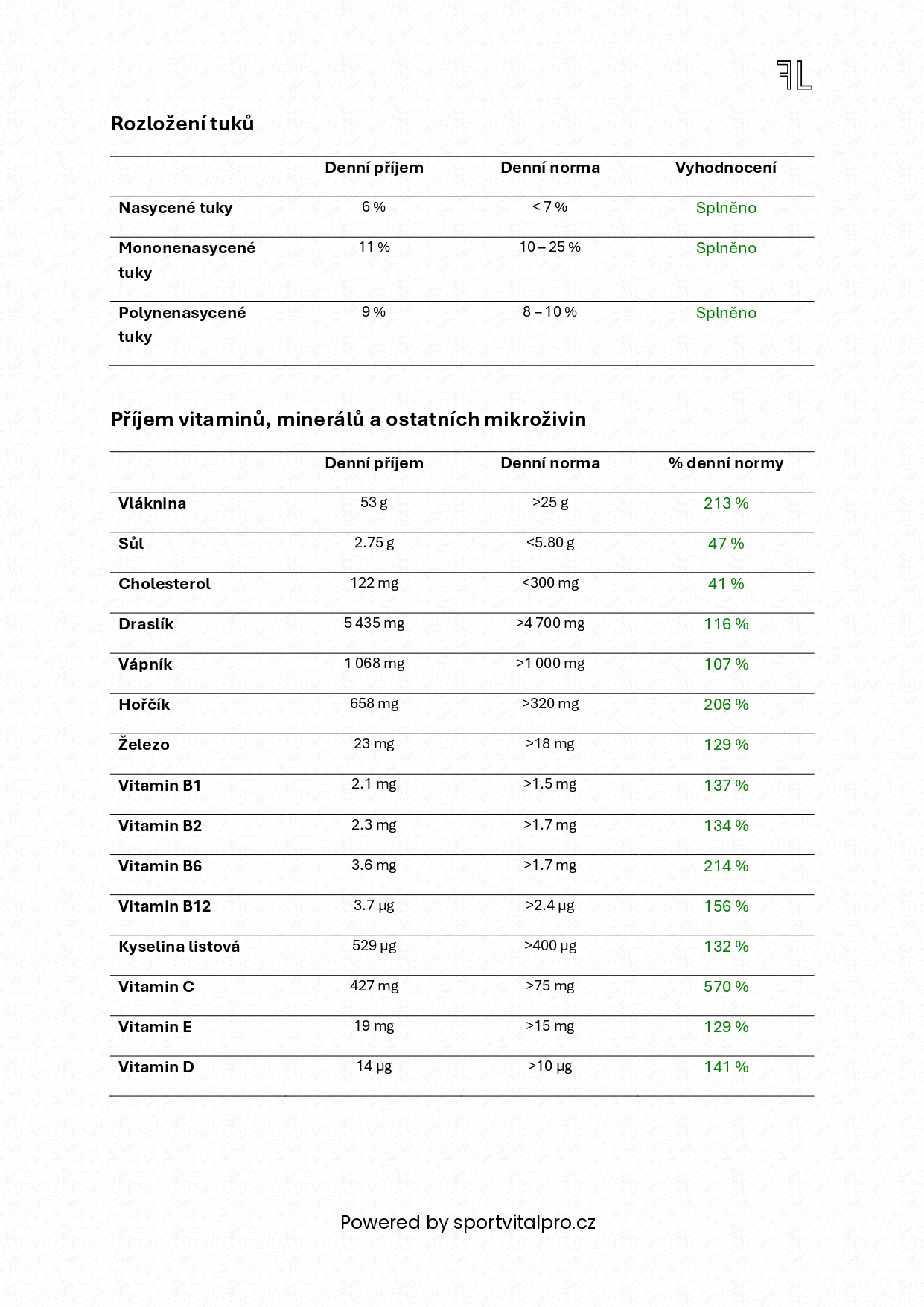 Shrnutí všech hlavních živin do čtyř přehledných kategorií. Kliknutím zobrazíte detaily.